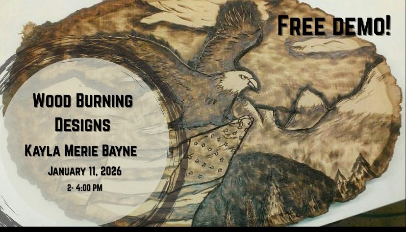 For January’s Free Art Demonstration with the Cabarrus Art Guild (CAG), local artist, Kayla Merie Bayne will show a wood burning technique on a 3-dimensional sculpture, using mixed media (i.e., wood, glue, paint).